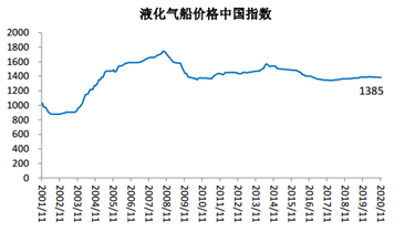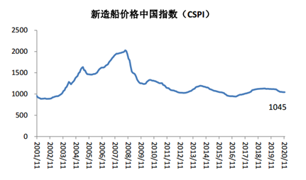 2020年11月,新造船价格中国指数为1045点,环比上升1点。其中,散货船、集装箱船、油船、液化气船的新造船价格中国指数分别为1249点、806点、1159点、1385点,环比分别持平、下降3点、上升6点、持平。