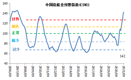 在上述指标综合影响下,2021年9月中国造船业景气先行指数为142点,环比上升2点;中国造船业景气同步指数为97.4点,环比下降2.4点;中国造船业预警指数为109.0点,环比上升4.1点。综上所述,中国造船业预警指数已处于“过热”区间。