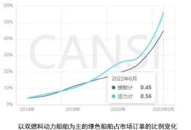 2022年上半年,新造船市场回落之际,以双燃料动力船舶为主的绿色船舶继续“高歌猛进”。采用双燃料动力的新船订单占市场比例快速扩大,以艘数与运力计分别从2021年的26%与30%,攀升至今年上半年的45%和56%,再创新高。船型结构向集装箱船、油船、散货船等传统船型延伸。另外,燃料类型也不再是单一的“LNG”,甲醇、生物质能甚至是氢也出现在订单当中,未来也将有“氨”。