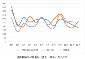 造船新接、完工降幅继续收窄,手持订单同比增长。2022年1-11月,世界新造船市场成交7454万载重吨、3859万修正总吨,同比分别下降37%、15%;完工交付7453万载重吨、2691万修正总吨,同比分别减少5.5%、7.8%。截至11月底,世界手持订单2.14亿载重吨、1.05亿修正总吨,同比分别增长5.8%、38.2%。下图分别为世界新造船成交情况对比和世界新船交付月度对比变化。