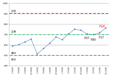 2022年中国造船产能利用监测指数(CCI)764点,达到近10年以来的最高点,与2021年相比提高22点,同比增长3.0%。