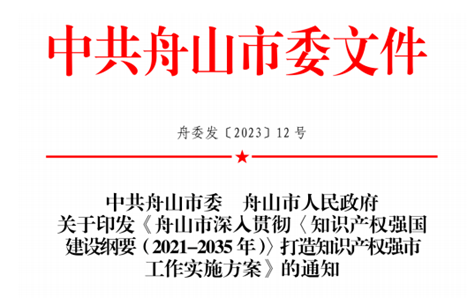 5月8日,舟山市发布《舟山市深入贯彻〈知识产权强国建设纲要(2021—2035年)〉打造知识产权强市工作实施方案》(舟委发(2023)12号,简称《方案》)。