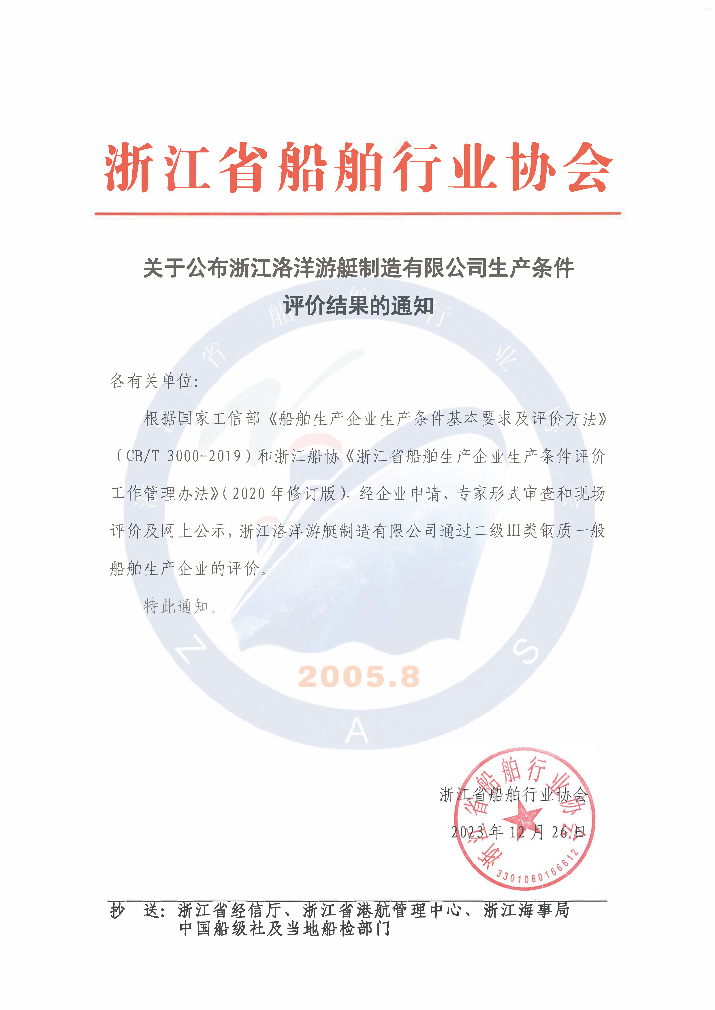 关于公布浙江洛洋游艇制造有限公司生产条件评价结果的通知