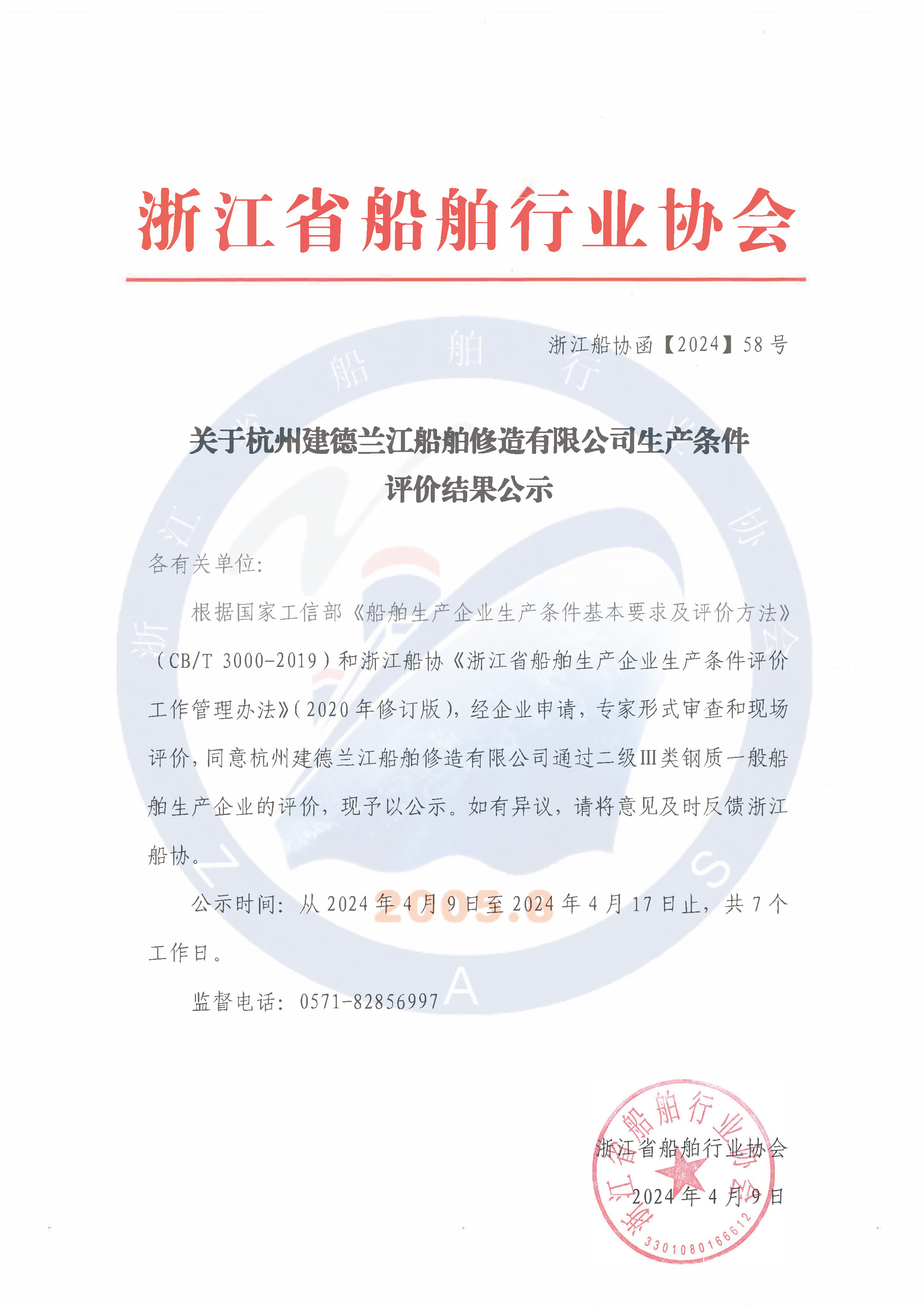 关于杭州建德兰江船舶修造有限公司生产条件评价结果公示